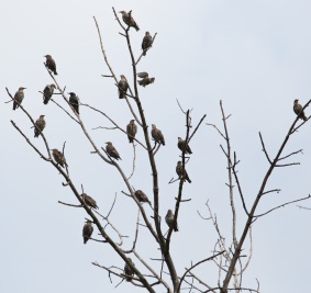 Yesterday in the car park a singing tree a young leafless sapling to be precise and a horde of fledged starlings thirty or more perched on the branches singing in unison a real piece of choral music that startled me with the beauty of the melody