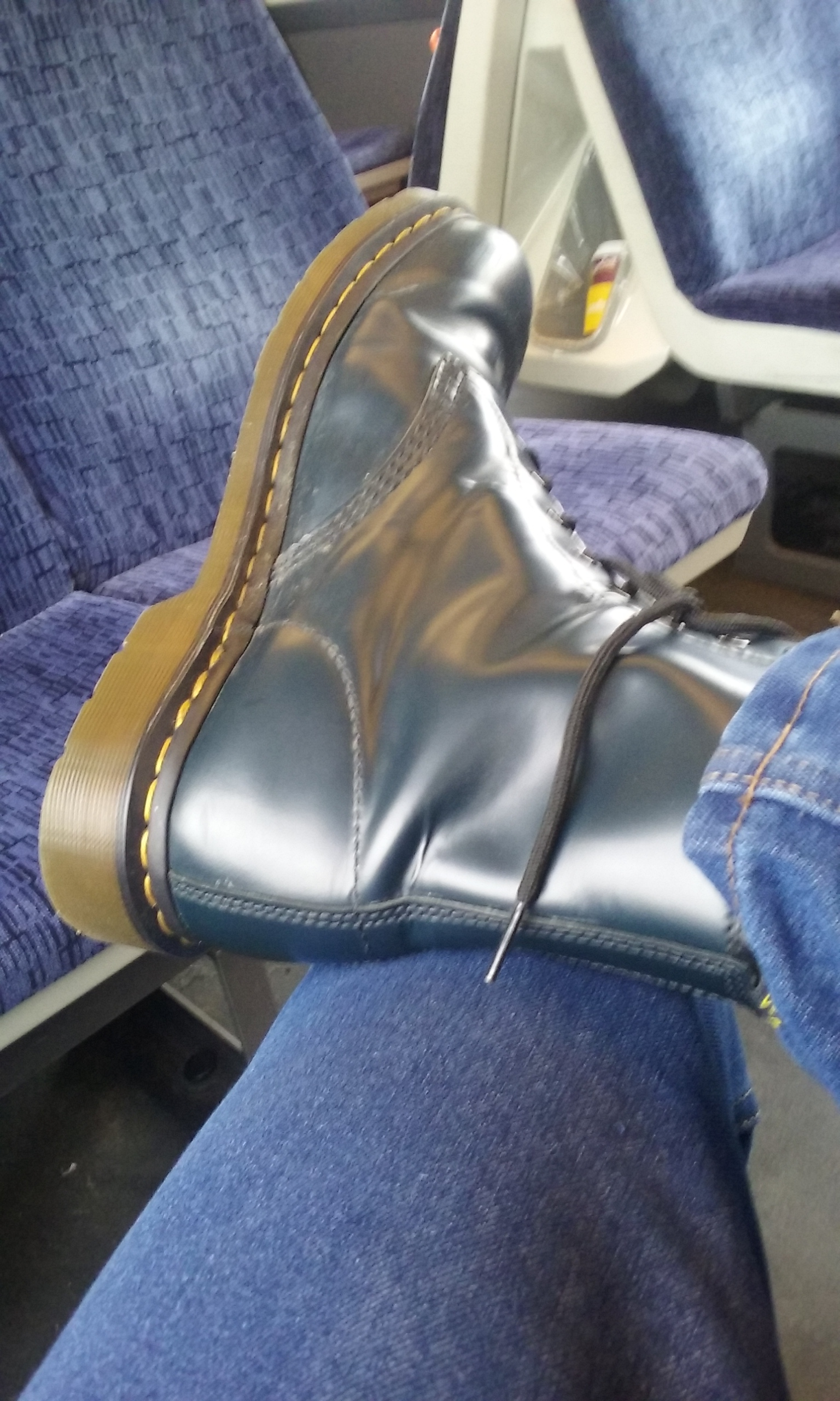 Shanks’s pony. That’s the appropriate name for the means of transport favoured by our intrepid blogsworth as he travels ceaselessly across the great metropolis of London Town and beyond, to bring exclusive reports and features to our valued readership. But does he secretly have a convertible Audi TT hidden away in the garage to be used on rainy days or to swank it up and down the King’s Road on sunny Sunday afternoons with the roof off, you may ask? He does not! Ecological to the core, our man insists, come rain or high water, on putting the footwork in wherever he goes. No stranger to the demands of fashion and colour coordination, the observant reader will note from the accompanying photo that the boots are always selected to combine with whatever means of transportation they are partnering with on any particular occasion. In the case illustrated, the boot was chosen in order to match the luscious celestial blue upholstery of Southeastern Railways’ carriages. The assignment, on this occasion? A trip to the mediaeval town of Dartford to check out the checkout operation at the relatively new branch of Aldi. Working undercover he purchased three rib-eye steaks and a bag of mixed, prewashed salad leaves and some mashed potato, all destined for an afternoon barbecue at the brother’s house. But the opportunity was used to interrogate Sharon on the second till from the left as you enter the store.
