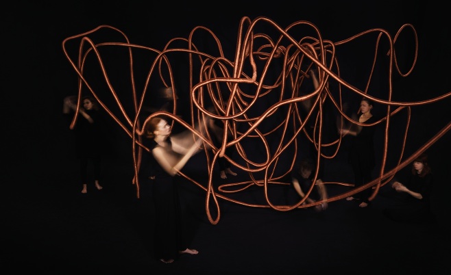 Two sculptures in particular caught my imagination: the first was a staircase wrapped in the luminous thread, and such was the scintillating play of light that it appeared to be a staircase to heaven. The second sculpture (illustrated at the top of the page) was a huge, twisting and turning cable of copper rope suspended from the ceiling in one room creating a beautiful abstract space that visitors are able to walk through and therefore observe the rope from every dimension.