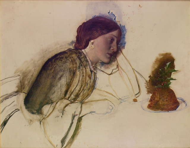 On this occasion, Jonah’s focus was on the museum’s collection of 19th century paintings and for today’s post he has chosen to feature something seasonal: The poor Actress’s Christmas Dinner, by Robert Braithwaite Martineau (1826–1869), which dates from around 1860. The artist initially trained as a lawyer but later entered the Royal Academy where he was awarded a silver medal. He studied under the Pre-Raphaelite artist William Holman Hunt and once shared a studio with him. The painting in question, although unfinished, provides poignant example of mid-Victorian pathos. The stylised, melancholy portrait of the actress is beautifully executed, although she appears to be marooned in the emptiness of the canvas. It is pointless to speculate why Martineau abandoned this particular study, but it does indicate something of the manner in which the artist intended to build up his composition, working from the centre outwards.